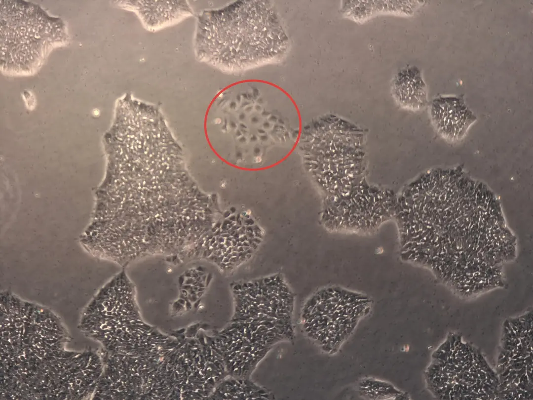 这是自发分化的早期表现!一旦发现,提示你需要尽快传代或剔除分化区域,否则整个克隆都可能“沦陷”。
